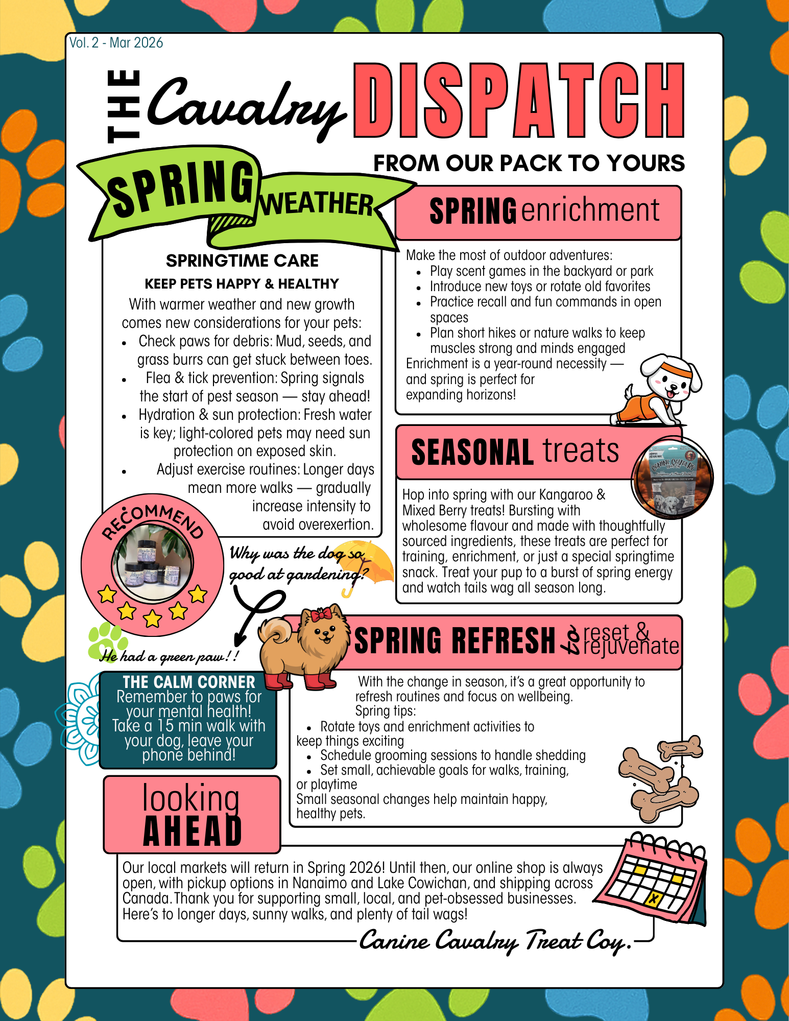 The Cavalry Dispatch is our seasonal blog-style newspaper where we share what’s new at Canine Cavalry Treat Coy, along with practical tips and tricks for pet guardians, behind-the-scenes updates, product spotlights, and community news. You’ll also find the occasional recipe, a few groan-worthy dog jokes, and uplifting moments to make you smile.